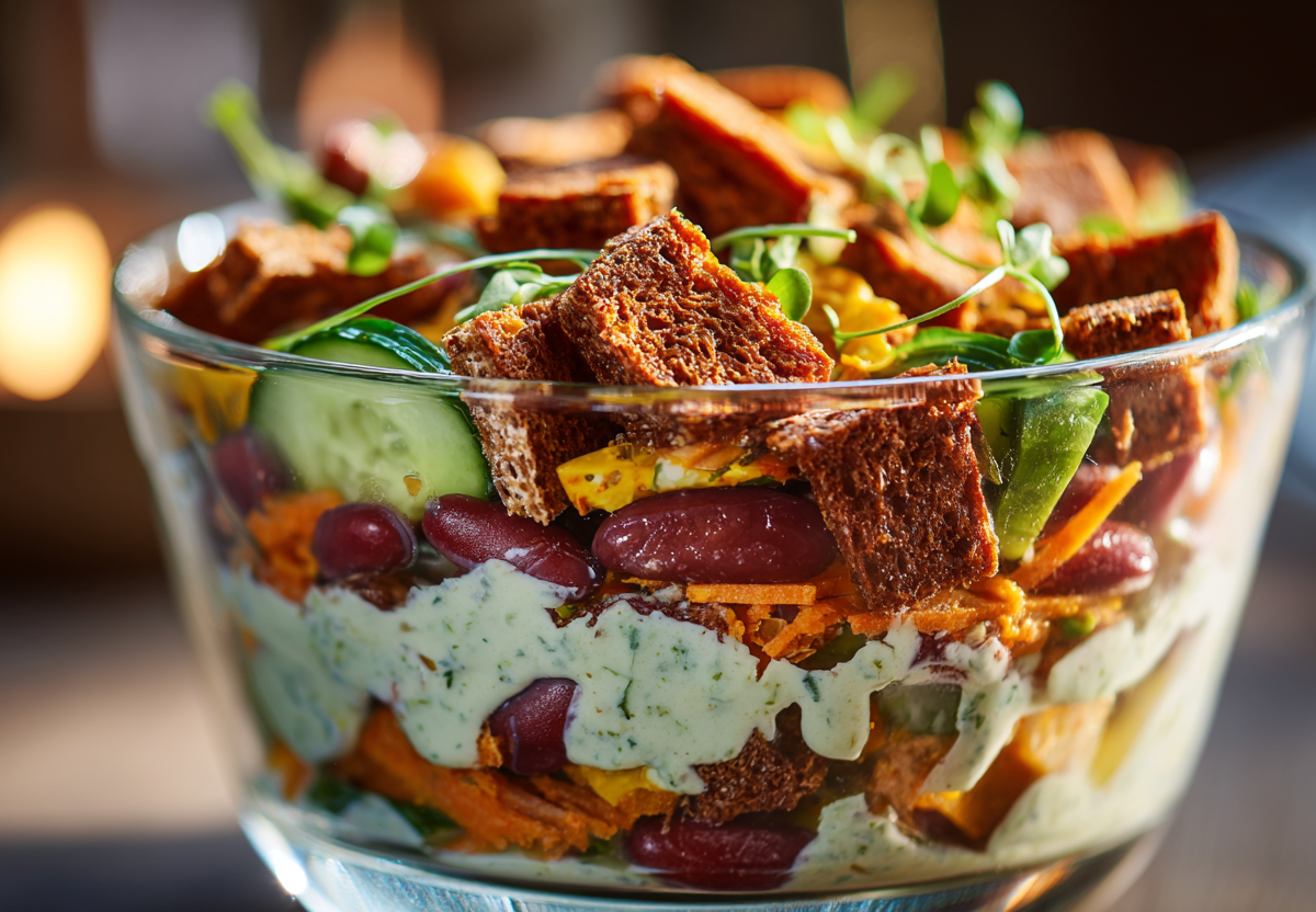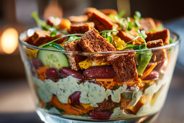 Сейчас на пике популярности рецепты из серии «открыл и смешал». Этот салат как раз такой! В нем нет ни вареного картофеля, ни яиц. Хрустящие сухарики, нежная фасоль и пикантная корейская морковь создают богатый вкус, который кажется гораздо сложнее, чем есть на самом деле.