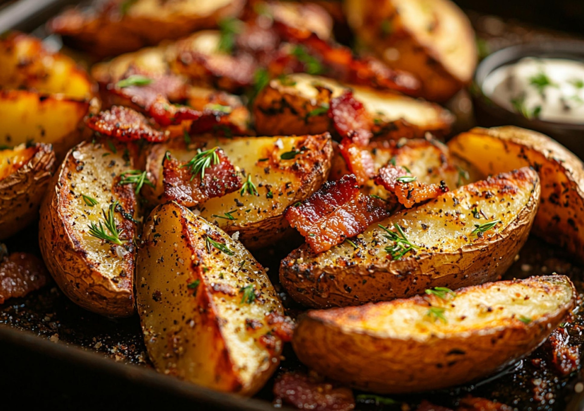 Обваливаем в этой ароматной смеси наши картофельные дольки, чтобы каждая покрылась золотистым «загаром». Выкладываем картошку по-деревенски на противень кожурой вниз — это секрет идеальной хрустящей корочки! Запекаем 40 минут при 200°C. За 10 минут до готовности щедро посыпаем кубиками бекона (100 г), чтобы он подрумянился и подарил блюду дымную нотку. Подаем с чесночно-сметанным соусом, обильно посыпав свежим укропом.