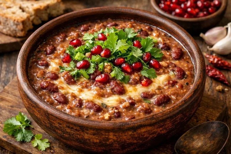 В самом конце вмешайте щедрую горсть рубленой кинзы и зелени сельдерея. Лобио должно получиться густым, почти как паштет, но при этом сочным. Подавайте его в глубоких тарелках, посыпав свежей зеленью и зернами граната для кислинки и красоты. Идеально — с кукурузным хлебом, но и обычный лаваш подойдет отлично.