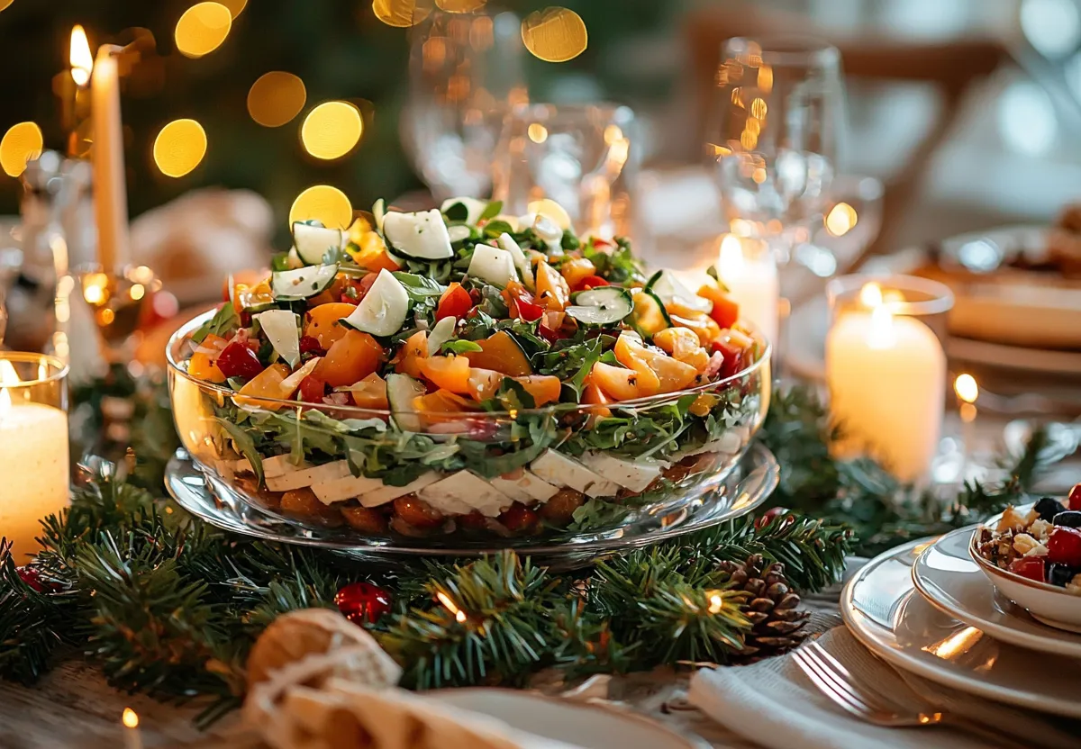 Возьмите следующие продукты: тофу — 250 г, картофелины — 3 шт., морковки — 2 шт., свеклу — 1 шт., маринованные огурчики — 2 шт., соевый пармезан — 100 г, грецкие орешки — 50 г, постный майонез — 150 г, соль и перец на свой вкус, зелень и гранатовые зерна для декора.