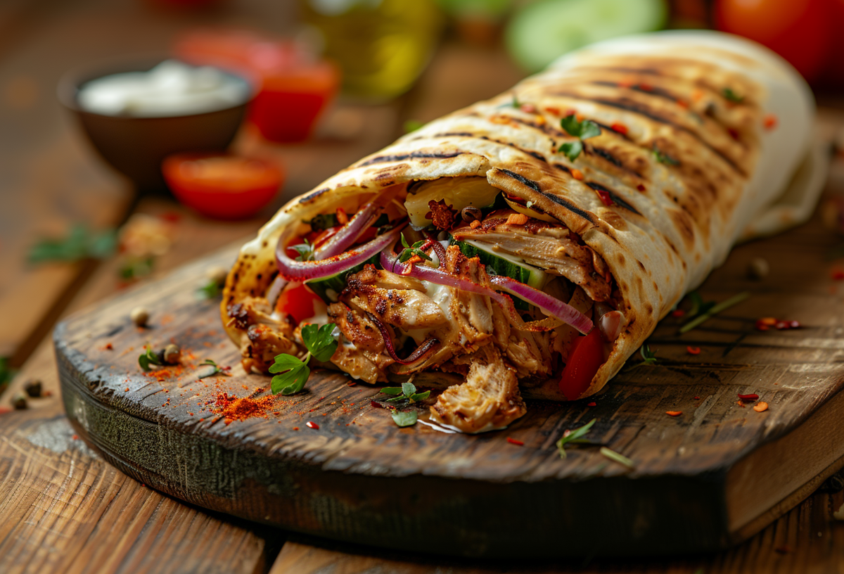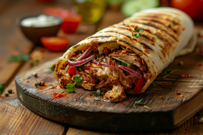 Возьмите четвертинку круглого турецкого хлеба или питу, прогрейте ее в духовке или на сухой сковороде до хрустящей корочки. Сделайте карман и щедро смажьте его изнутри соусом. Выкладывайте слоями: сначала овощи, затем мясо, снова овощи и финальный аккорд — еще одна ложка соуса сверху.