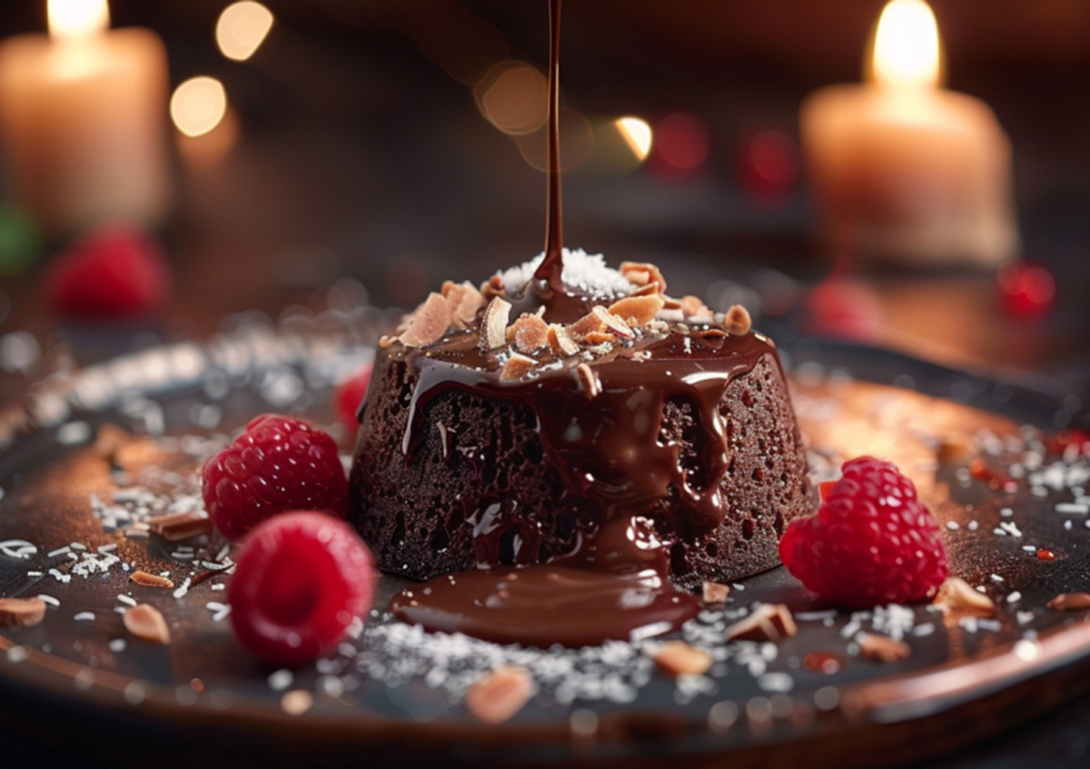 Растопите 150 г веганского темного шоколада с 100 г кокосового масла, смешайте с пюре из 2 спелых бананов, 50 г миндальной муки, 2 ст. л. какао и щепоткой соли. Разлейте по формочкам, выпекайте 12 минут при 180 градусах. Внутри десерт останется жидким. Калорийность — 320 ккал на порцию. Украсьте ягодами малины и посыпьте кокосовой стружкой. Добавьте бокал безалкогольного игристого.