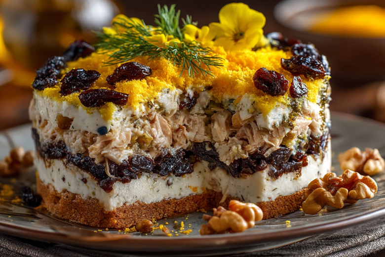 Слоеный салат с курицей, черносливом и грецкими орехами