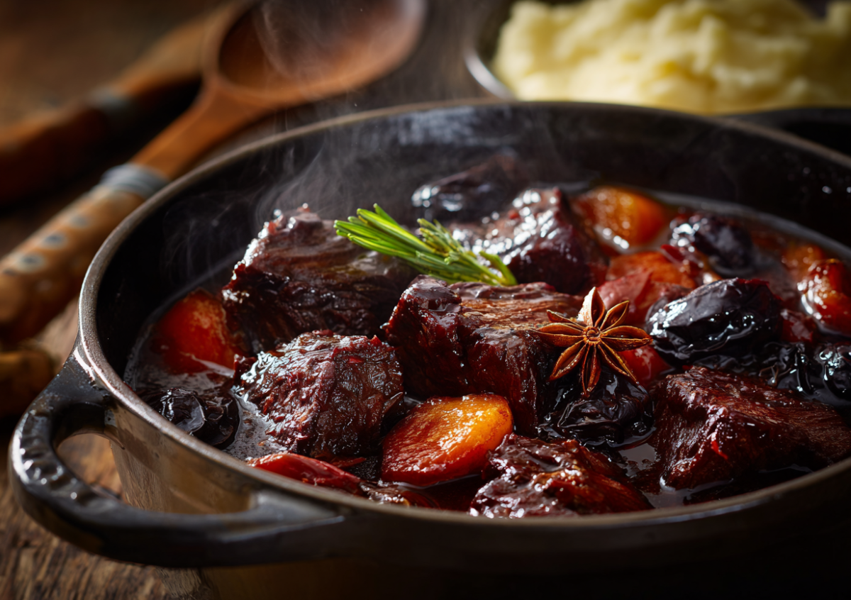 800 г говяжьей лопатки или щек крупно нарежьте. Обжарьте куски до румяной корочки. Добавьте 1 крупную морковь и 1 луковицу, нарезанные крупно, пассеруйте. Влейте 400 мл глинтвейна (или 300 мл красного вина + 100 мл бульона), чтобы жидкость покрывала мясо наполовину. Добавьте 100 г промытого чернослива, звездочку бадьяна и 3-4 горошины душистого перца. Тушите под крышкой на медленном огне 2–2,5 часа. В конце добавьте соль и столовую ложку томатной пасты. Подавайте с пюре.
