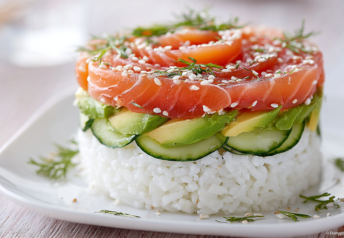 Сделайте второй слой точно так же: рис, сыр, рыба. Верх можно украсить тонкими ломтиками лосося внахлест, чтобы получилась красивая «розетка», посыпать белым кунжутом и зеленью. Перед подачей поставьте торт в холодильник на 30–40 минут, чтобы он держал форму.