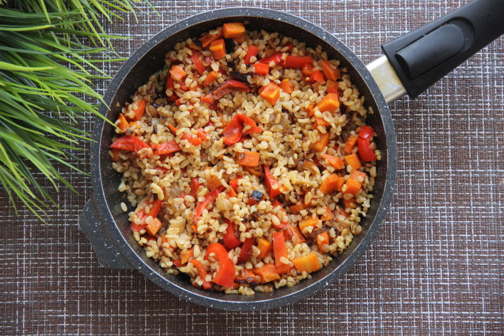 Сначала обжарьте овощи до мягкости (около 5–7 минут). Важный секрет: всыпьте сухой булгур прямо к овощам и обжаривайте его 2–3 минуты, постоянно помешивая. Крупа должна пропитаться маслом и начать издавать легкий ореховый аромат — это сделает готовое блюдо рассыпчатым.