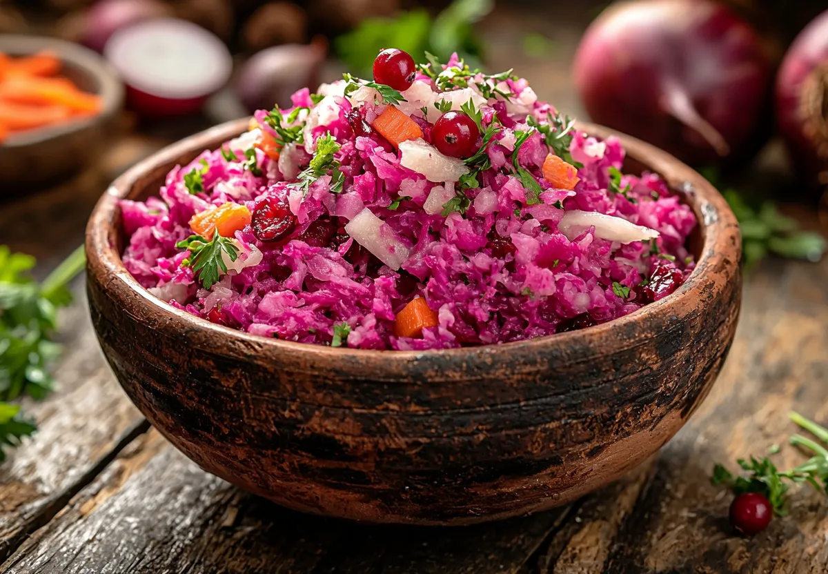 Для приготовления вам понадобятся: свекла (1-2 штуки среднего размера), морковь (1 крупный плод), квашеная капуста (200–250 граммов), репчатый лук (1 головка, предпочтительно красный или фиолетовый), немного клюквы (2–3 столовые ложки — свежей или замороженной) для кислинки и душистое подсолнечное масло (3–4 столовые ложки для заправки).