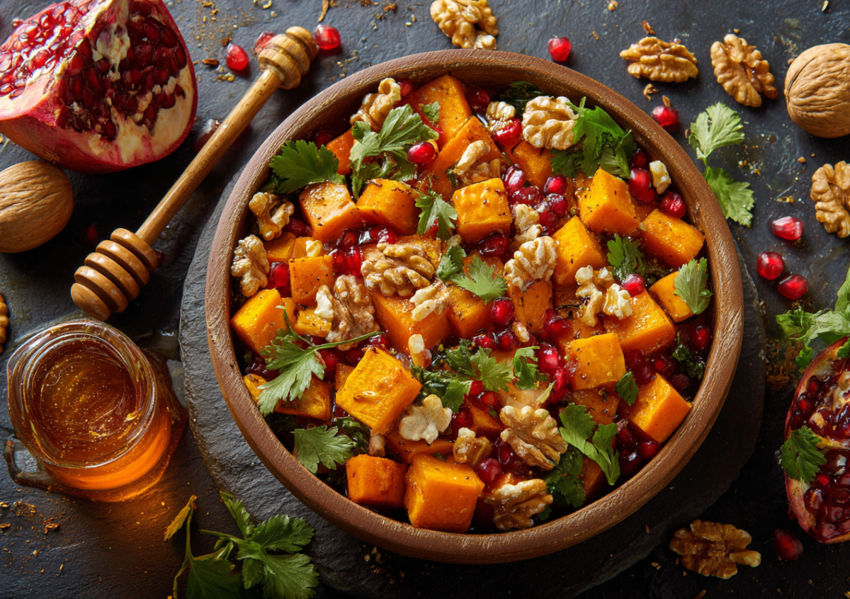 Нарежьте мякоть тыквы (400 г) крупными ломтиками, сбрызните оливковым маслом, добавьте щепотку молотого кумина и соль. Запекайте при 200 °C до мягкости и легкой карамелизации. В это время на сухой сковороде обжарьте горсть грецких орехов до аромата, затем крупно порубите. В большой миске соедините теплую тыкву, орехи и горсть зерен граната. Для заправки смешайте столовую ложку гранатового соуса наршараб, чайную ложку жидкого меда и две столовые ложки оливкового масла. Полейте салат, аккуратно перемешайте и сразу подавайте, украсив веточками кинзы. Контраст сладкой тыквы, кислого граната и пряной зелени создает праздничный вкус.