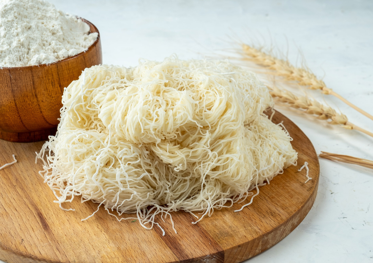 Другой рецепт теста катаифи предполагает замену части муки на кукурузный крахмал.