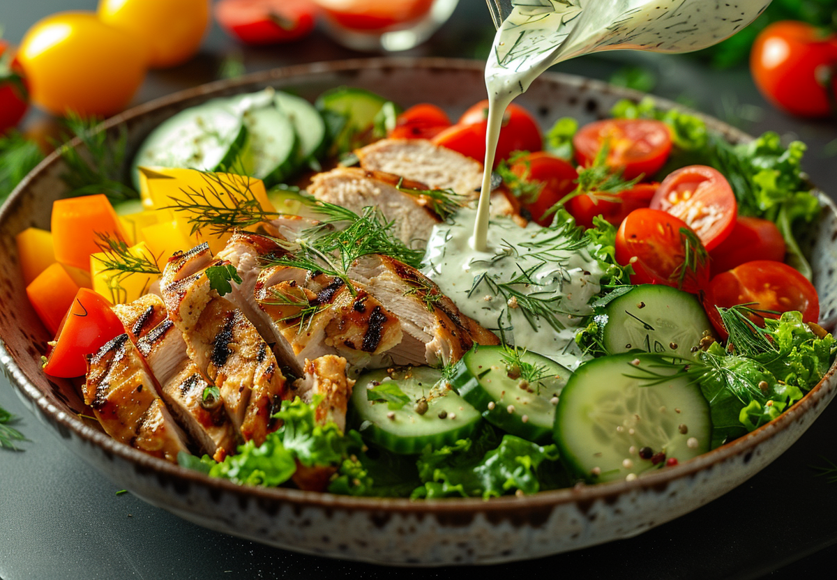 Сытный салат с курицей и авокадо