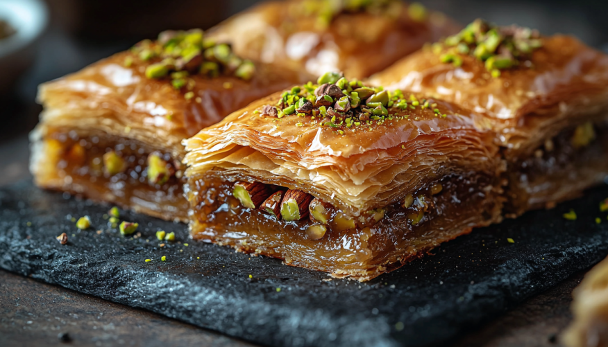 Нарежьте тесто с орехами на ромбики до выпечки, полейте маслом. Выпекайте турецкий слоеный пирог 40 минут при 180C до золотистости. Смешиваем продукты для сиропа и варим смесь 15 минут. Потом заливаем баклаву теплой жидкостью. Дайте выпечке отдохнуть 6 часов. И все! Не забудьте приготовить угощение к праздничному столу, наверняка ваши гости еще такого не пробовали!