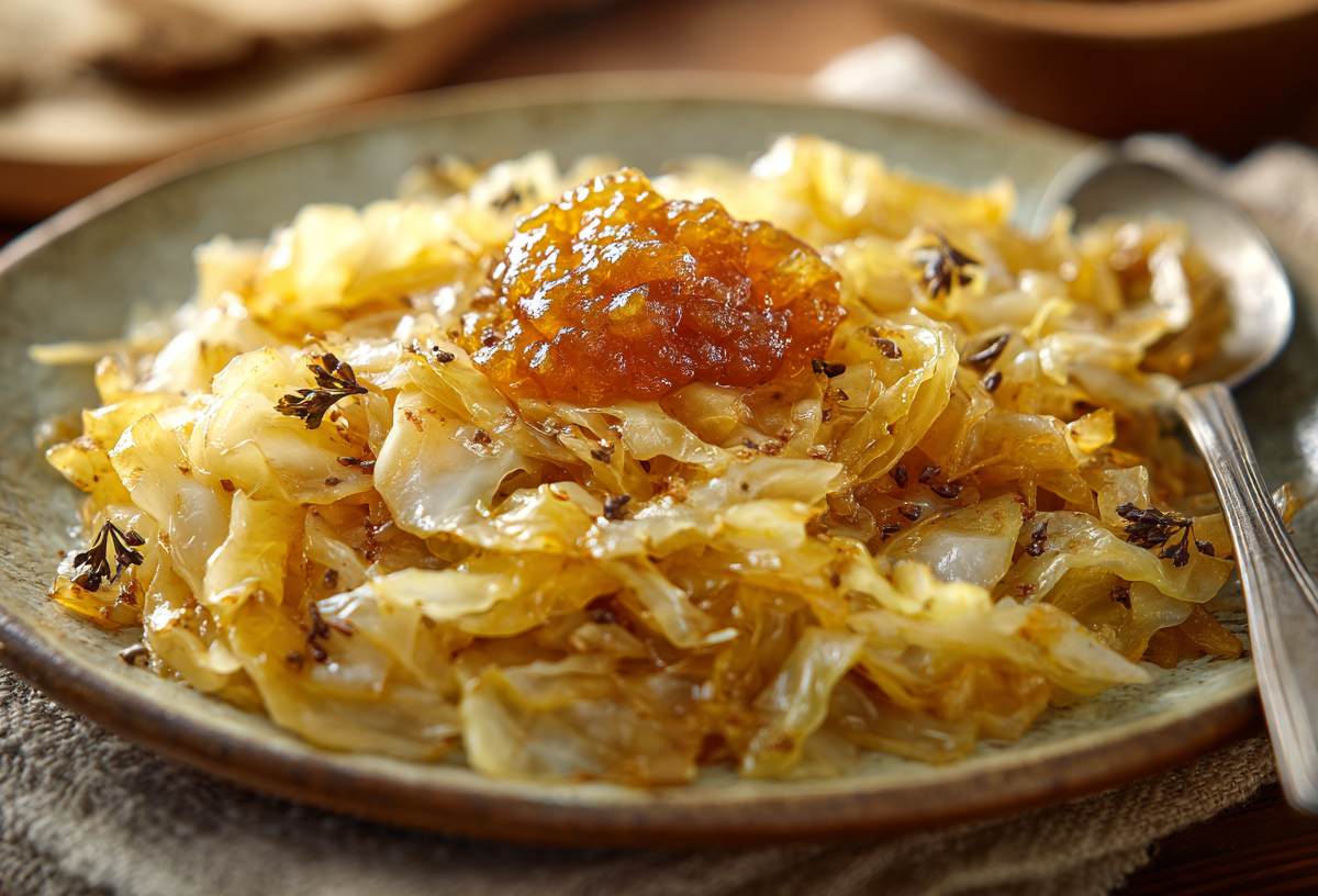 Начните с приготовления яблочного джема. Натрите на крупной терке два кислых яблока и потушите их в сотейнике с ложкой меда и столовой ложкой яблочного уксуса до состояния густого пюре. Отдельно в глубоком сотейнике обжарьте на сливочном масле до золотистости одну нарезанную луковицу и столовую ложку семян тмина. Добавьте половину кочана тонко нашинкованной капусты, влейте полстакана овощного бульона и тушите под крышкой 20 минут. Затем снимите крышку, добавьте щепотку мускатного ореха, увеличьте огонь и выпарите лишнюю жидкость. Для подачи выложите тушеную капусту на тарелку, сделайте углубление и положите туда ложку яблочного джема.