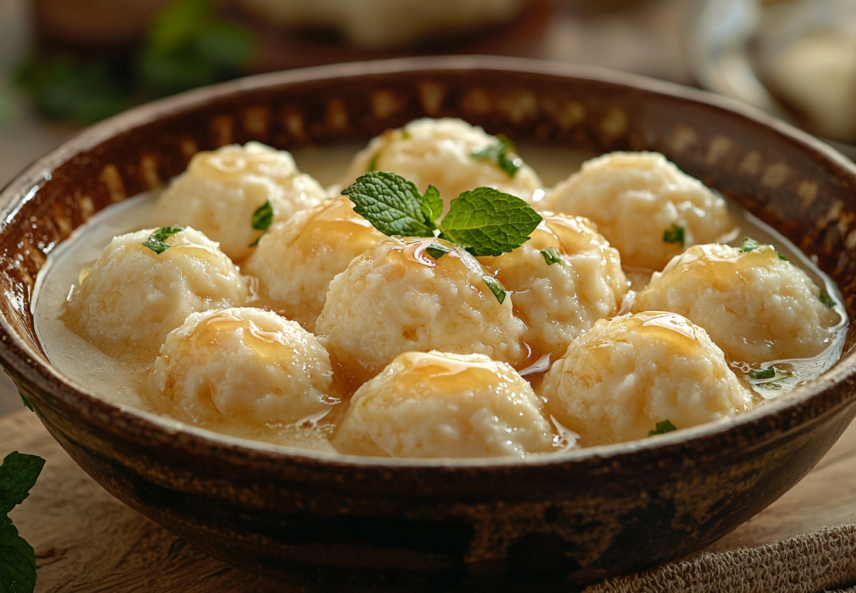 Грузинские надуги — одна из самых простых грузинских сладостей, которую легко приготовить дома. Для классического варианта возьмите свежий творог (мягкий, не слишком сухой — 400 г), добавьте немного меда (2–3 ст. л.) или сахар по вкусу, мятной зелени и скатайте небольшие шарики. Можно добавить немного измельченных грецких орехов или цедры лимона для аромата. Затем приготовьте сироп — традиционно используют воду и сахар, иногда с добавлением меда для придания особого вкуса. Шарики опустите в горячий сироп (можно использовать заранее приготовленный фруктовый сироп, мед, жидкий джем или просто растопленный мед с водой) и дайте им немного настояться.