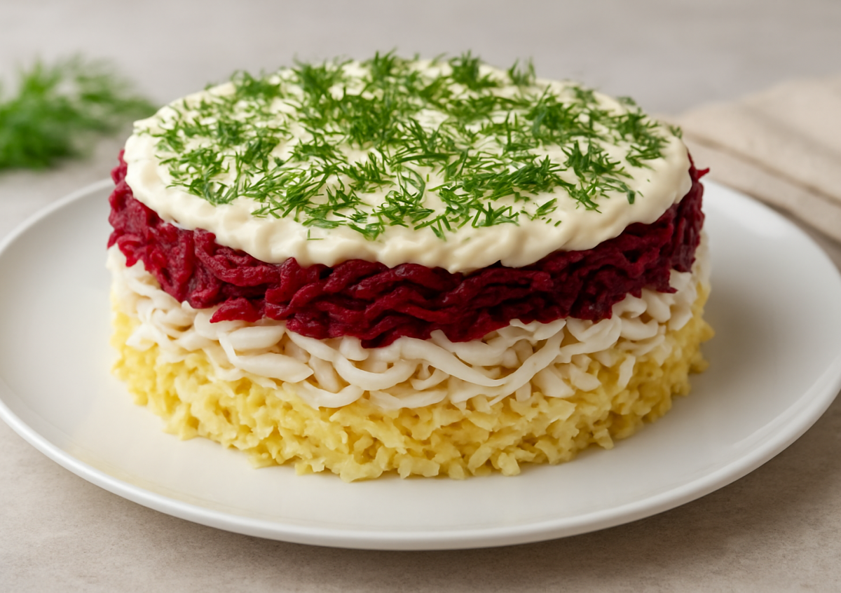 Легкая вариация на тему привычной шубы превращается в свежий морской салат, где нежные кальмары прекрасно сочетаются с мягкой свеклой, картофелем и легкой заправкой. Вкус получается насыщенным, но без тяжести, а текстуры — мягкие и гармоничные. Подходит и для новогоднего стола, и для уютного семейного ужина.