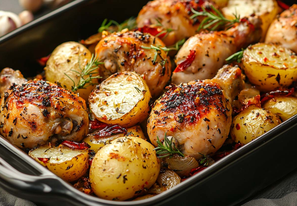 Это классическое блюдо для обеда или ужина. Хотите приготовить что-нибудь быстро, не заморачиваясь? Тогда вы по адресу! NEWS.ru публикует отличный рецепт. Для курицы с картошкой понадобится: 4–6 куриных окорочков, 1 кг картошки, 2 луковицы, 4 зубчика чеснока, 3 ст. л. сметаны, соль, паприка, сушеные травы, перец. Ну что, поехали? Вперед в магазин, а потом на кухню! Будет еще вкуснее, если у вас мясо домашней курицы и сметана. Сочность гарантирована!