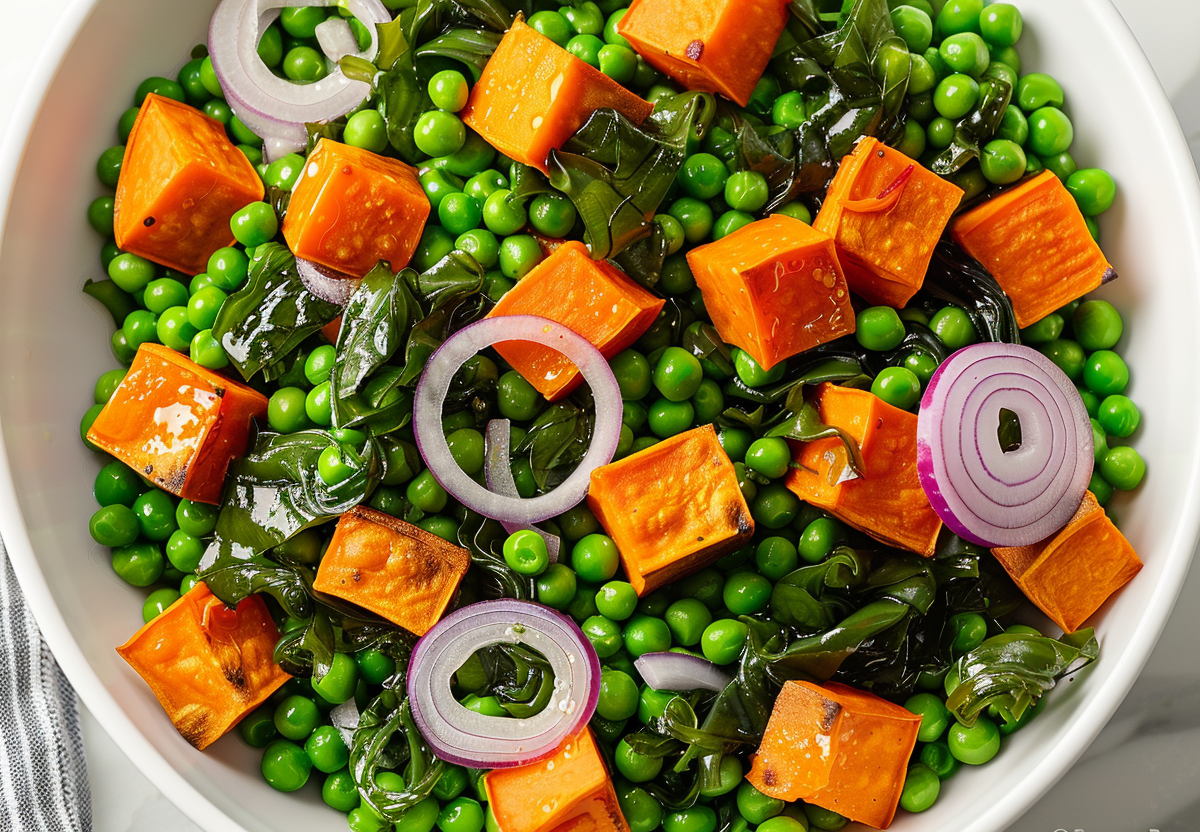 Отвариваем 2 крупных батата до мягкости, охлаждаем и нарезаем аккуратными кубиками. Добавляем 200 граммов зеленого горошка (консервированного или замороженного, бланшированного 2 минуты) и 150 граммов готовых маринованных водорослей чука. А потом подарим винегрету сочности и характерного хруста, порезав сочную красную луковицу полукольцами.