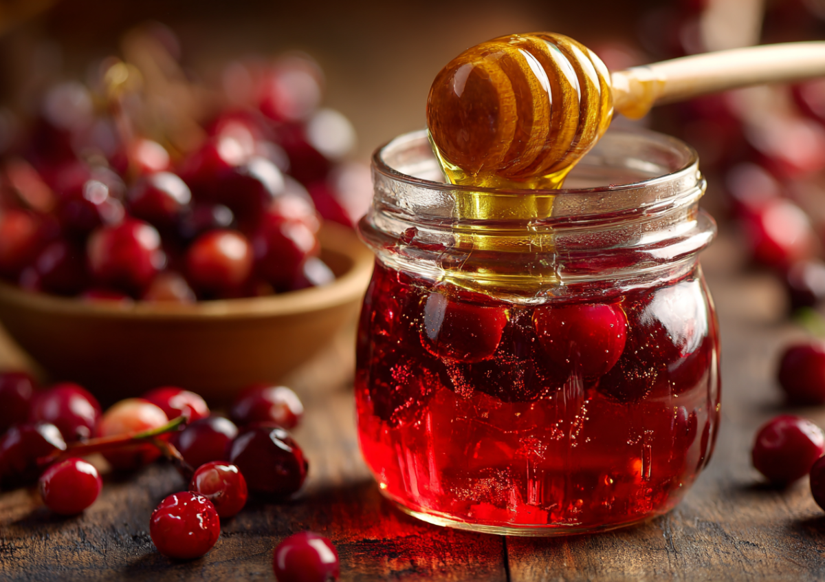 Этот способ заготовки требует минимум усилий. Ягоды перебираем и промываем. На килограмм клюквы берем пол-литра воды и 400 граммов натурального меда. Воду доводим до кипения, растворяем в ней мед и получаем душистый сироп. Заливаем ягоды горячим медовым сиропом и оставляем для пропитки на сутки. Затем аккуратно прогреваем смесь до 80 градусов, не допуская кипения, и сразу разливаем по стерильным банкам. Закатываем крышками, укутываем до полного остывания. Хранить такое лакомство лучше в прохладном месте.