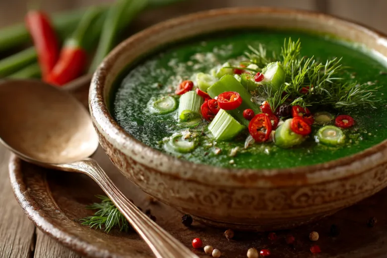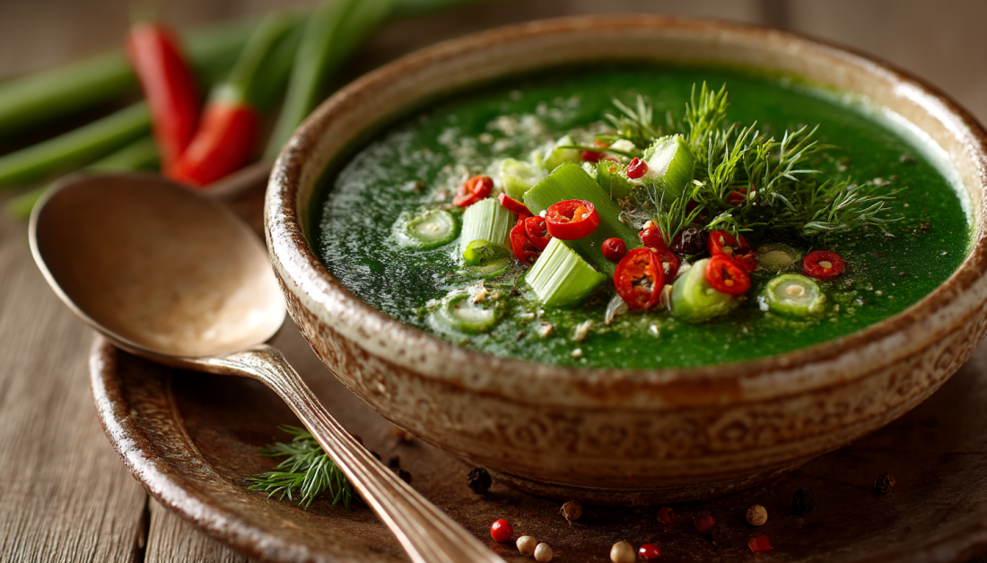 Этот зеленый весенний суп готовится за 20 минут и содержит природные вещества, стимулирующие расход калорий. Капсаицин из перца чили (всего 0,5 г) повышает температуру тела на 0,3–0,5 °C, что увеличивает энергозатраты на 5–7% в течение 2–3 часов после еды.