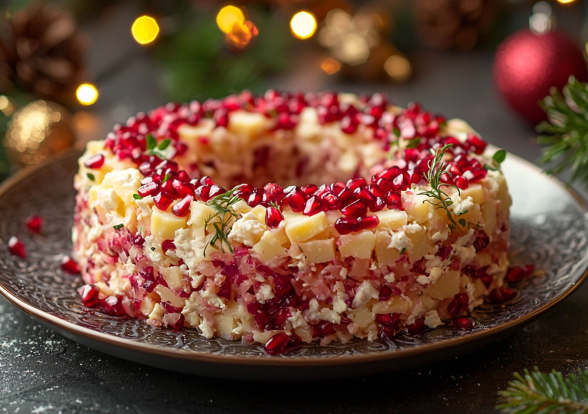 Этот салат неизменно становится украшением праздничного стола. Гранатовые зерна дают красивый рубиновый блеск, а внутри скрываются нежная курица, мягкие овощи и легкий майонезный соус. Собирается «Гранатовый браслет» быстро, но выглядит так, будто над ним работали несколько часов.