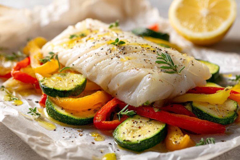 Приготовление: нарежьте овощи полосками, выложите на пергамент. Сверху положите филе, сбрызните маслом и лимонным соком. Запекайте 20 минут при 180 градусах.