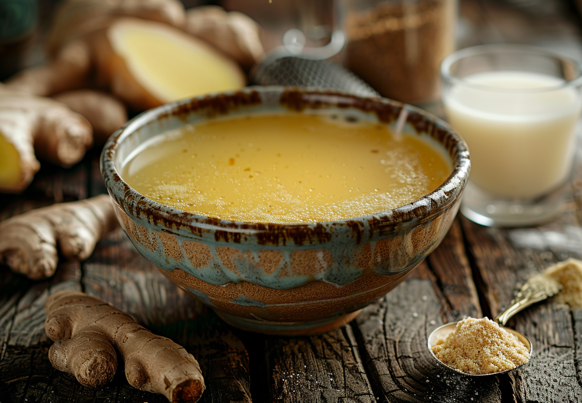 Подогрейте куриный бульон, смешайте его с тертым имбирем и соевым соусом. Молоко взбейте в плотную пену, чтобы приготовить качественное средство от похмелья, и добавьте в основную жидкость.