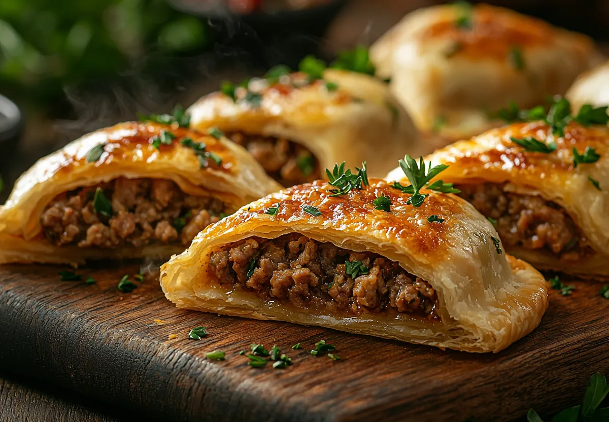Разделите тесто на четыре части и раскатайте каждый кусочек в очень тонкую лепешку. На одну сторону выложите по 2 ст. л. фарша, разровняйте тонким слоем, накройте второй половиной и аккуратно защипните края.