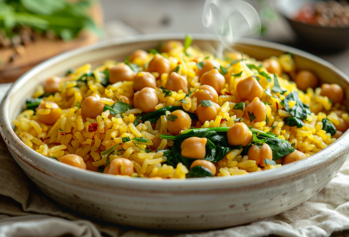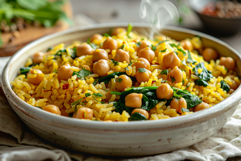 Для приготовления понадобятся: длиннозерный рис (200 г), нут отварной (150 г), свежий шпинат (80 г), лимонный сок (2 ст. л.), чеснок (2 зубчика), куркума (1/2 ч. л.), зира (1/2 ч. л.), оливковое масло (2 ст. л.), вода (400 мл), соль и черный перец по вкусу.