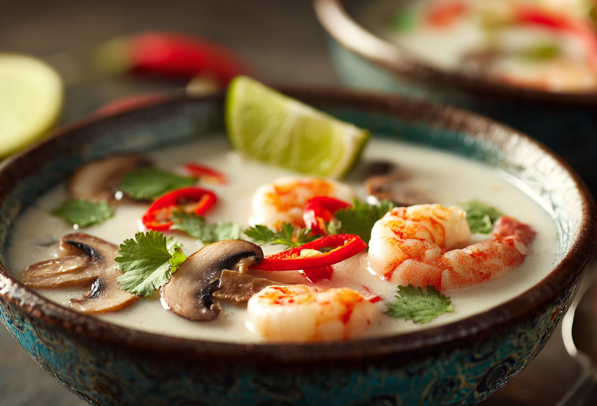 Начните с разогрева столовой ложки растительного масла в кастрюле с толстым дном. Обжарьте нарезанный тонкими лепестками имбирь, размятый стебель лемонграсса и измельченный чили до волнующего пряного аромата. Влейте горячий бульон, добавьте листья кафр-лайма и доведите до энергичного кипения. Убавьте пламя, погрузите в бульон нарезанные шампиньоны и вешенки, позволив им вариться семь минут для раскрытия вкуса. Теперь влейте кокосовое молоко, добавьте рыбный соус и тростниковый сахар, тщательно перемешав до его полного растворения. Не позволяя супу бурно кипеть, опустите в него очищенные креветки и раздавленные зубчики чеснока. Готовность наступит через три-четыре минуты, когда креветки побелеют и свернутся. Немедленно снимите кастрюлю с огня, удалите из бульона жесткие стебли лемонграсса и листья. Влейте сок целого лайма и щедро присыпьте суп рубленой кинзой. Подавайте этот обжигающе-пряный бульон без промедления, чтобы ощутить весь спектр пробуждающих контрастов.