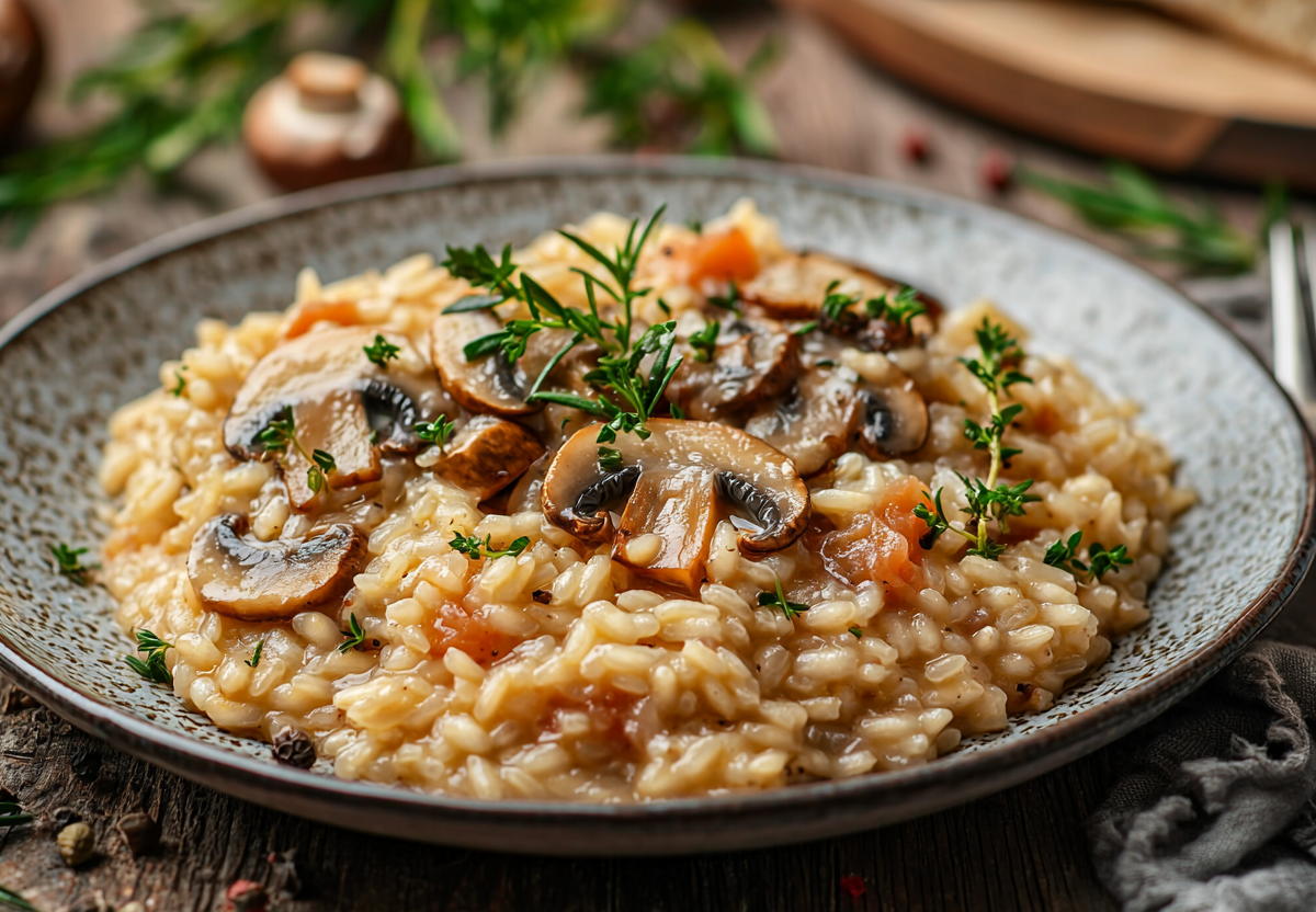 Итальянское ризотто — нежнее блюда вы не пробовали! Оно делается на основе риса. Что нужно, чтобы его приготовить? Рецепт найдете у нас! Вот ингредиенты: рис — 250 г; шампиньончики — 250 г; 1 луковица; вино белое сухое — 150 мл; бульон, в котором варилась курица, — 700 мл; сыр — 65 г; масло сливочное — 45 г; масло подсолнечное или оливковое — 30 мл; пара чесночных зубчиков, тимьян свежий — 2 веточки; перец и соль — на ваше усмотрение.