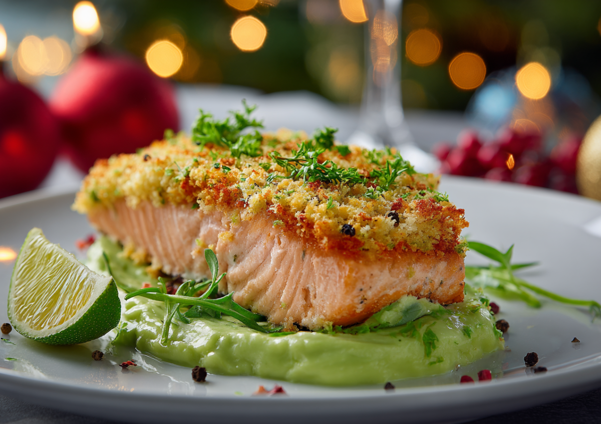 Стейки семги смазывают оливковым маслом, посыпают смесью пармезана и специй, запекают в разогретой до 200 °C духовке 20–25 минут. Для крема мякоть авокадо, горсть зелени, сок лайма, соль и перец взбивают блендером до состояния воздушного мусса. На тарелку выкладывают ложку крема из авокадо, сверху — горячий стейк с хрустящей сырной корочкой.