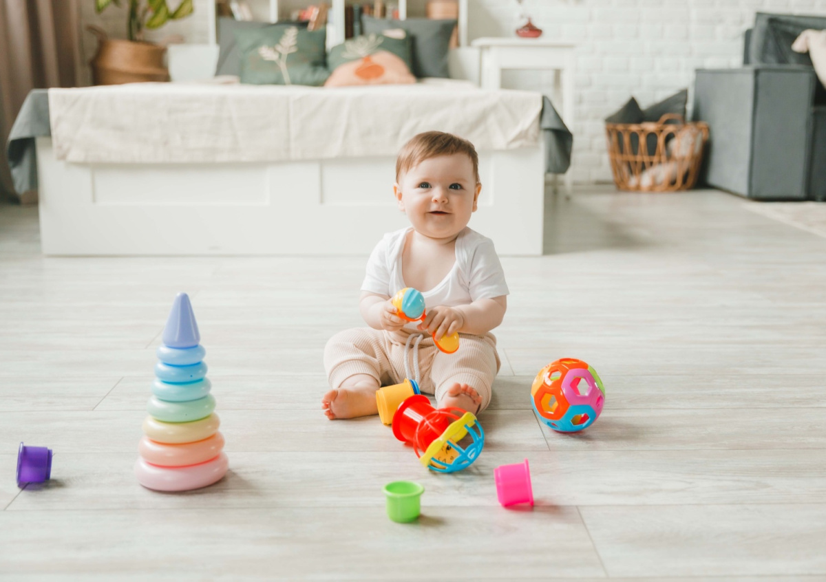 К году ребенок обычно уверенно сидит без поддержки, встает у опоры и передвигается вдоль нее приставным шагом. Многие карапузы делают первые самостоятельные шаги, хотя полноценная ходьба может сформироваться чуть позже. Малыш пытается самостоятельно пить из чашки, держит в руке ложку, захватывает мелкие предметы двумя пальцами. В речевом развитии появляются первые осмысленные слова: «мама», «папа», «дай», «на». Кроха понимает простые просьбы, машет ручкой на прощание, играет в ладушки. Он узнает близких людей, радуется их появлению, может показать части тела на себе или игрушке. Интерес к геометрическим фигурам только зарождается — малыш учится вкладывать предметы друг в друга, собирать простую пирамидку.