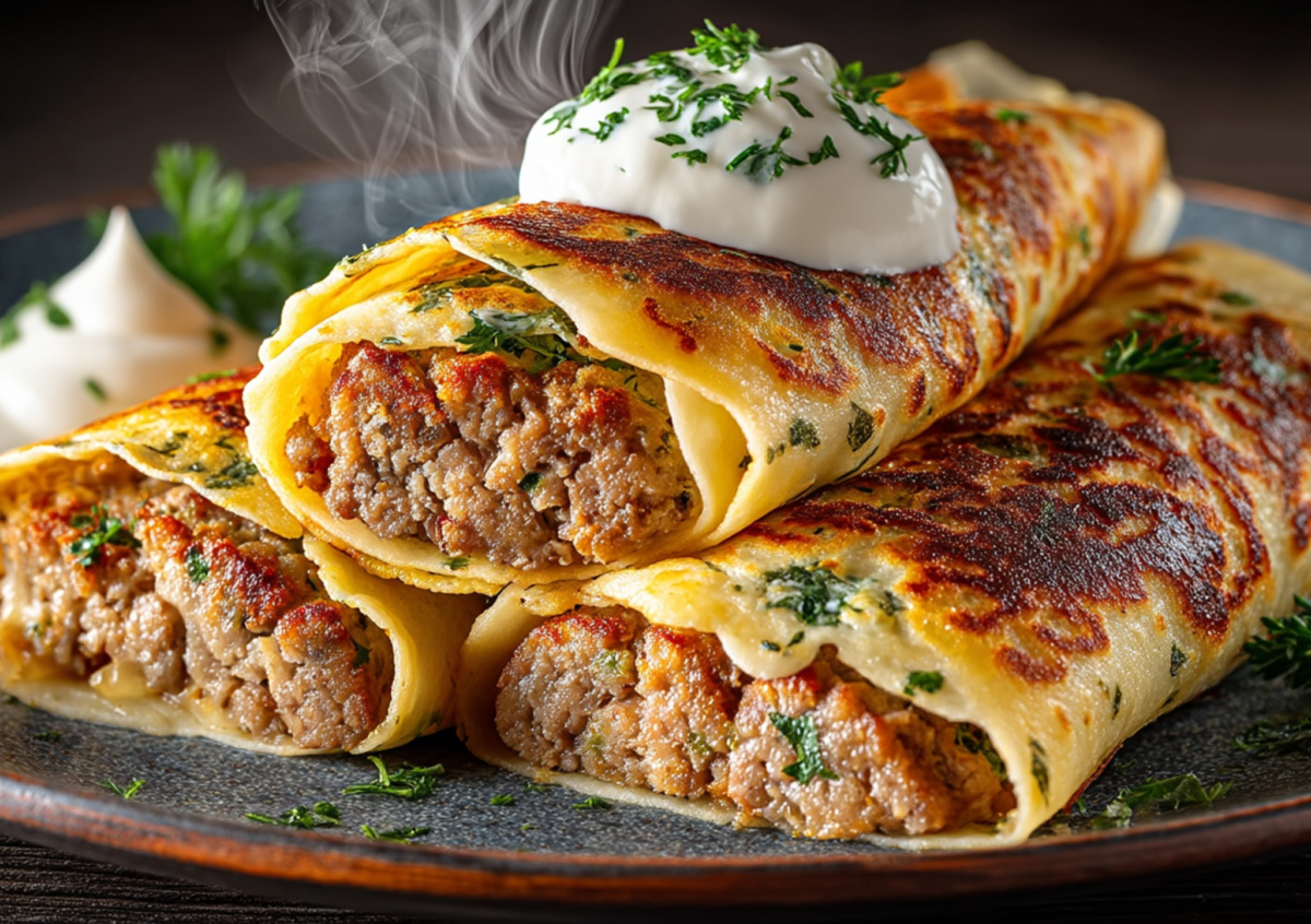 На Кубани и в южных регионах тонкие блинчики сворачивали с рубленным мясом, птицей, чесноком и зеленью — именно такие сытные рулетики и воспринимали как мужские начинки для блинов.