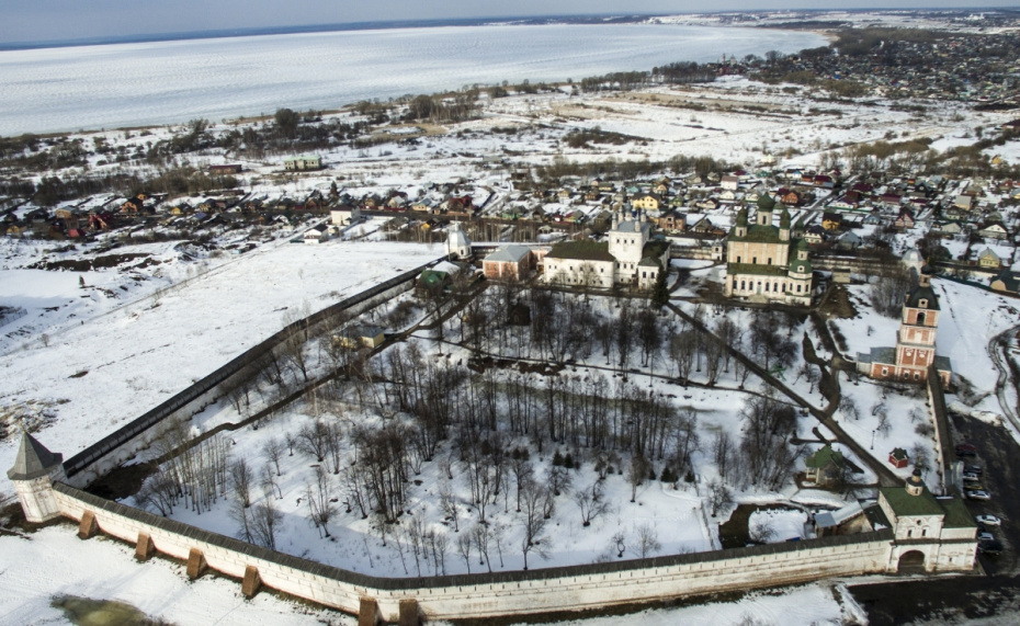 Старица зимой выглядит особенно торжественно. Белые стены монастыря под снежной шапкой, старинные дома и панорамы над рекой создают редкое ощущение русской глубинки.