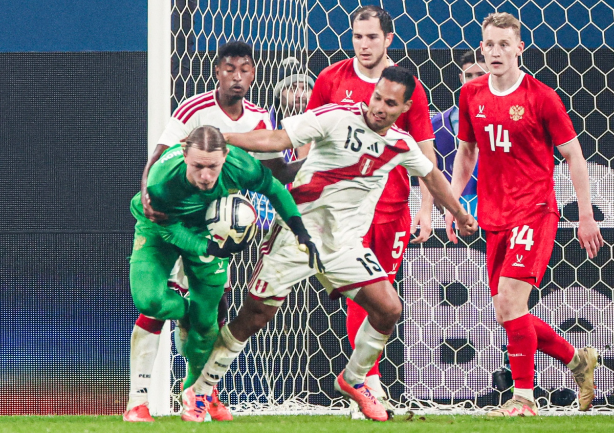 Товарищеский матч по футболу. Россия — Перу. Вратарь Матвей Сафонов (Россия), Ренсо Гарсес (Перу), Максим Осипенко (Россия), Виктор Мелехин (Россия) во время матча Товарищеский матч по футболу. Россия — Перу. Вратарь Матвей Сафонов (Россия), Ренсо Гарсес (Перу), Максим Осипенко (Россия), Виктор Мелехин (Россия) во время матча Фото: Петр Ковалев/ТАСС