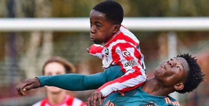 Madness. Ajax U15 player David Easmon (14) on the left played vs Spart Rotterdam on the weekend winning 6-2. The towering defender is breaking through the Ajax Academy but it’s just unfair! pic.twitter.com/GIFAc1KNOV