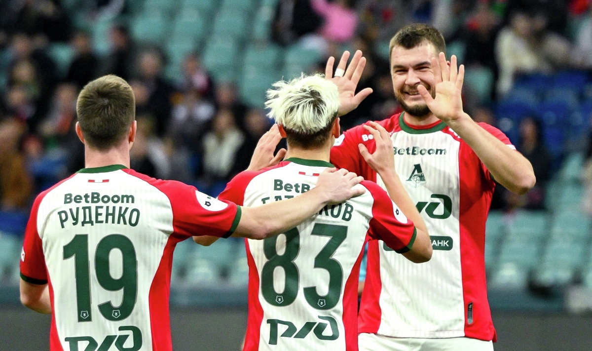 Александр Руденко («Локомотив»), автор гола Алексей Батраков («Локомотив») и Николай Комличенко («Локомотив») радуются забитому мячу в матче 18-го тура российской Премьер-лиги (РПЛ) в Сочи Александр Руденко («Локомотив»), автор гола Алексей Батраков («Локомотив») и Николай Комличенко («Локомотив») радуются забитому мячу в матче 18-го тура российской Премьер-лиги (РПЛ) в Сочи Фото: Екатерина Лызлова/ РИА Новости
