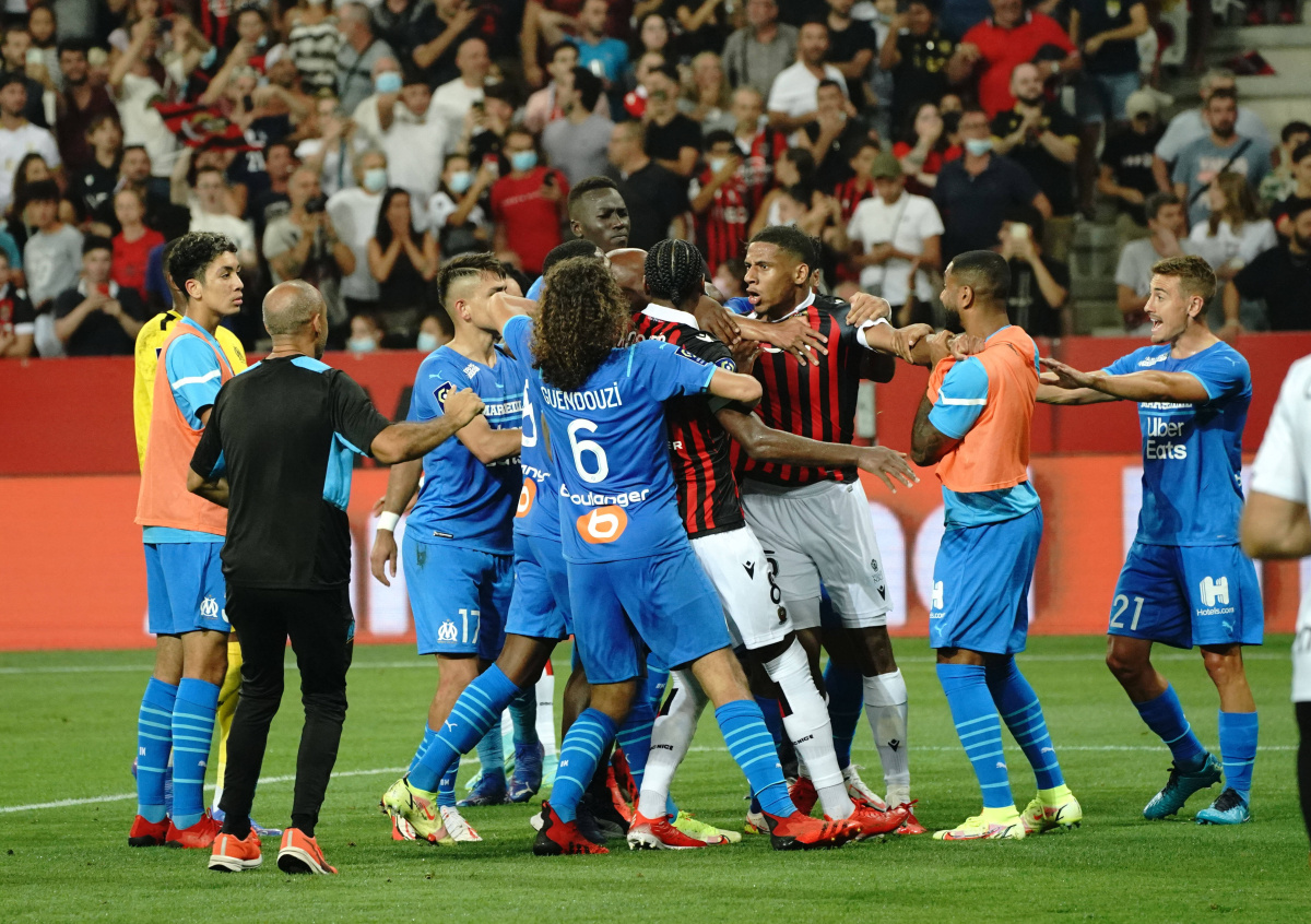 Во время розыгрыша углового в полузащитника «Марселя» полетели бутылки и другие предметы, в игрока попала одна из них, и он, не сдержав эмоций, схватил бутылку и швырнул обратно в сторону фанатов хозяев. Болельщики «Ниццы» выбежали на газон, началась потасовка.