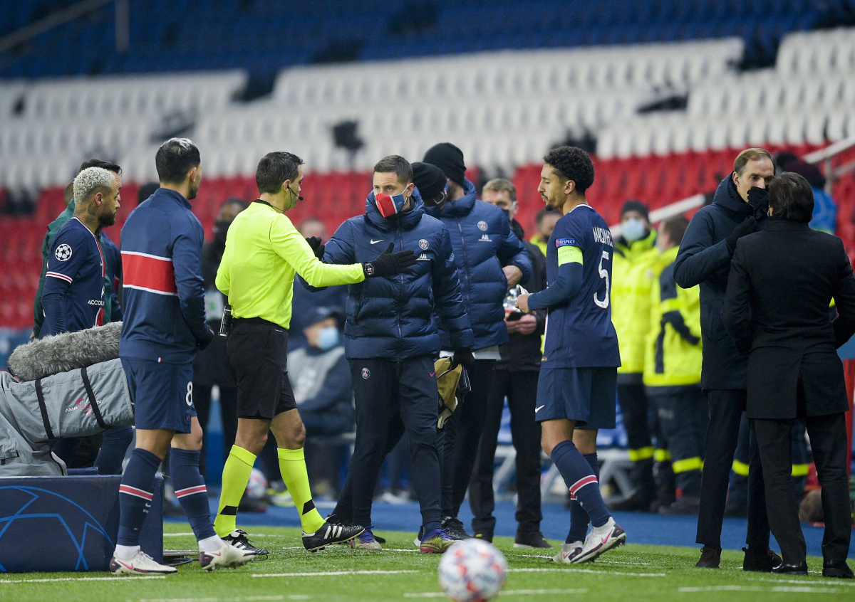 Матч между французским ПСЖ и турецким «Истанбулом» в рамках шестого раунда Лиги чемпионов прерван из-за высказываний резервного арбитра о «чёрном парне» в адрес одного из помощников тренера стамбульской команды Пьера Вебо.
