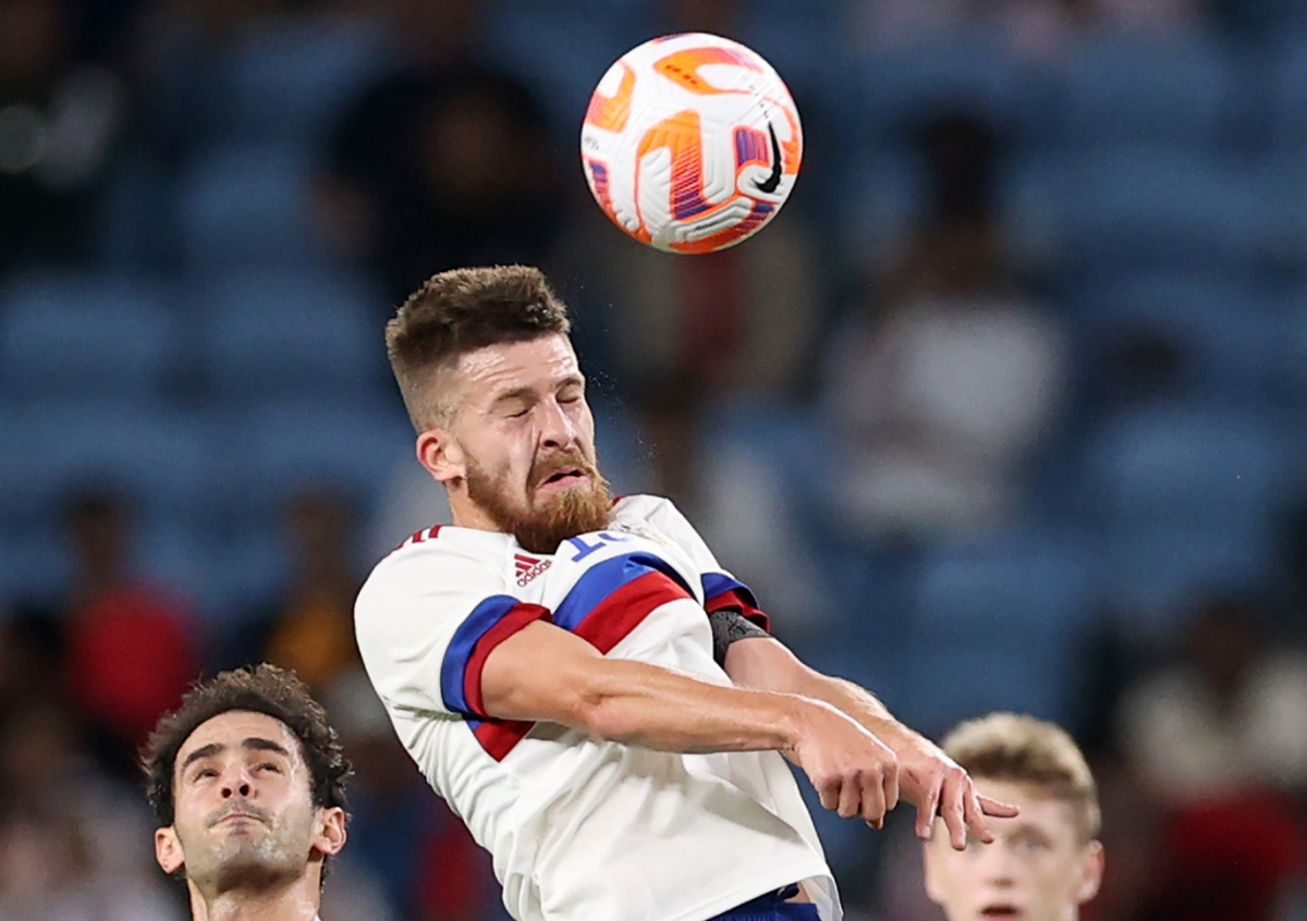 Товарищеский матч по футболу Катар — Россия. Ахмед Фатхи (Катар) и Даниил Хлусевич (Россия) во время матча