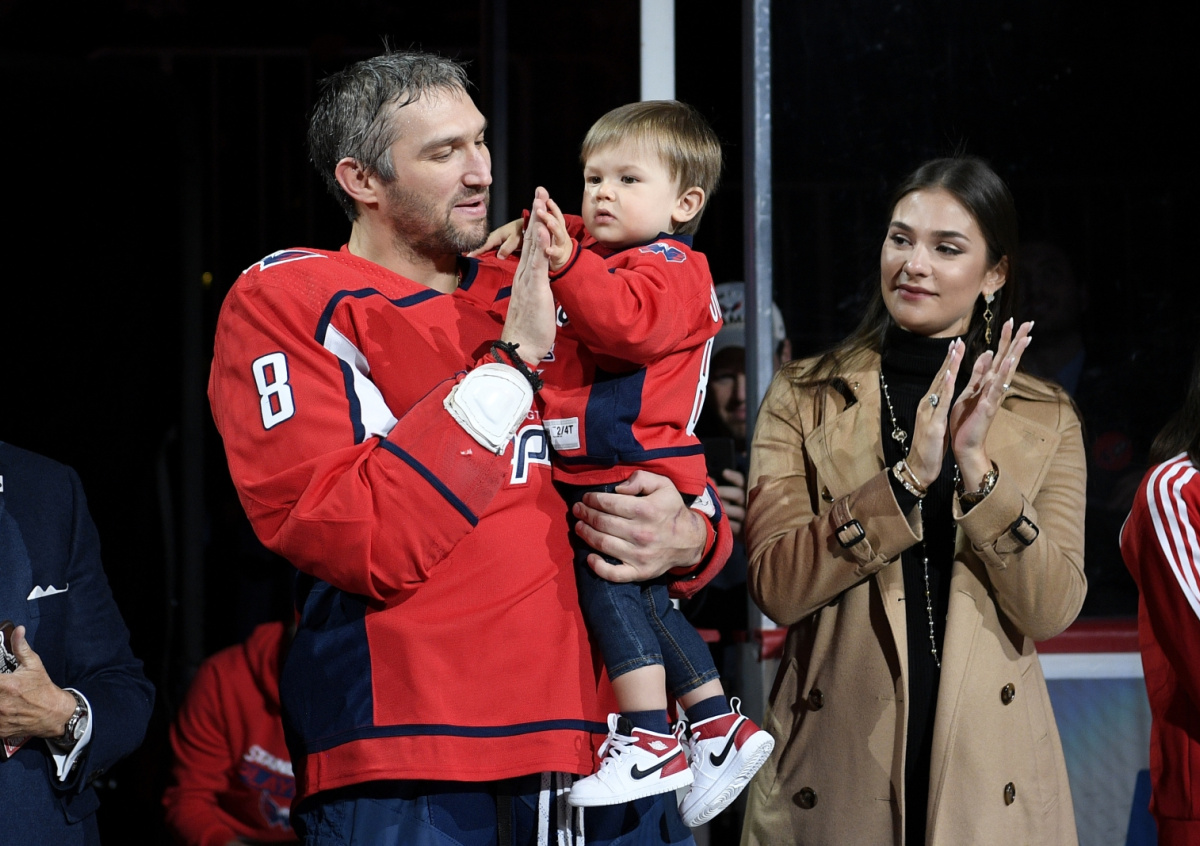 Александр Овечкин с супругой Анастасией Шубской и сыном Сергеем на церемонии празднования 700-й шайбы в карьере в НХЛ