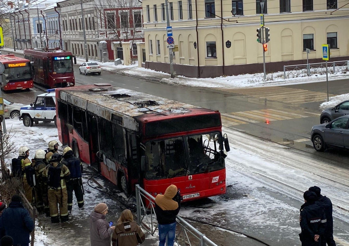 Пассажирский автобус полностью сгорел в центре Казани. В результате никто не пострадал.