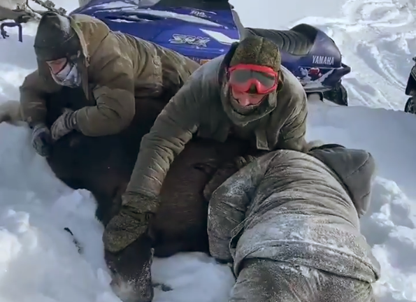 Ролик с жестоким убийством животного был обнародован в социальных сетях. Из него следует, что трое мужчин и одна женщина сначала преследовали лосиху на снегоходах, а когда она упала без сил, набросились на неё и задушили.