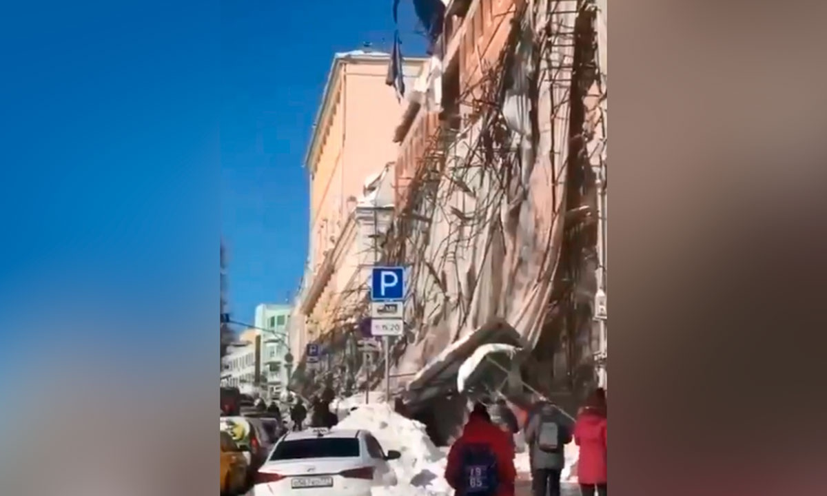 В центре Москвы строительные леса, возведённые возле фасада одного из зданий, обрушились на пешеходную зону под тяжестью скопившегося снега.