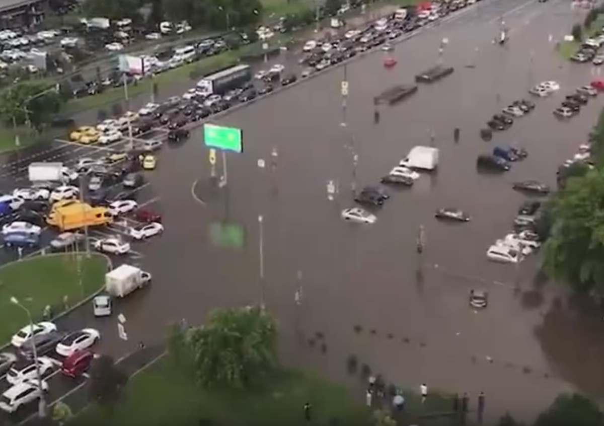 Проезжая часть Варшавского шоссе в Москве оказалась подтопленной из-за сильного дождя 20 июня 2020 года. Движение возможно только по левым рядам в обоих направлениях.