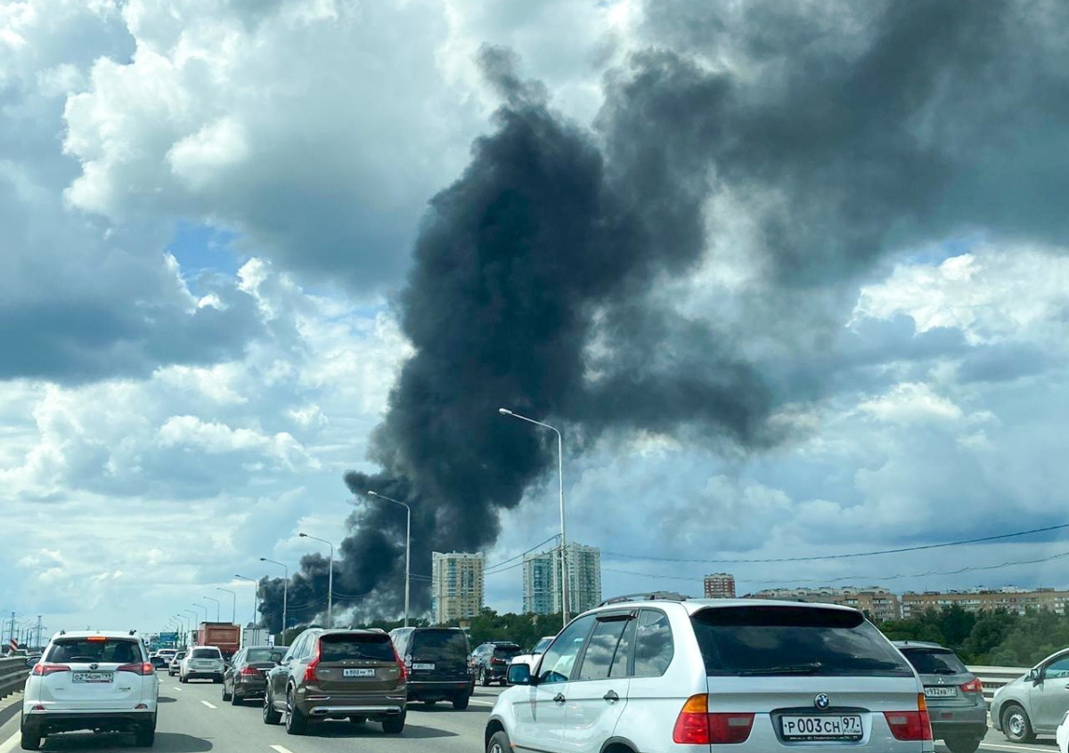 Очевидцы выложили в Сеть видео пожара. На кадрах виден огромный чёрный столб дыма, который поднимается сбоку от проезжей части.