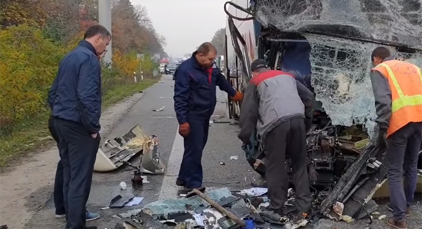 Видео сделали вскоре после столкновения. На кадрах видны последствия дорожной аварии. От сильного удара кузов автобуса сильно деформировался, лобовое стекло полностью смято. На дороге разбросаны осколки, части автобуса и вещи погибших, видны следы крови. В районе происшествия работают полицейские, много машин «скорой помощи». Полоса, где произошло ДТП, перекрыта для движения транспорта.