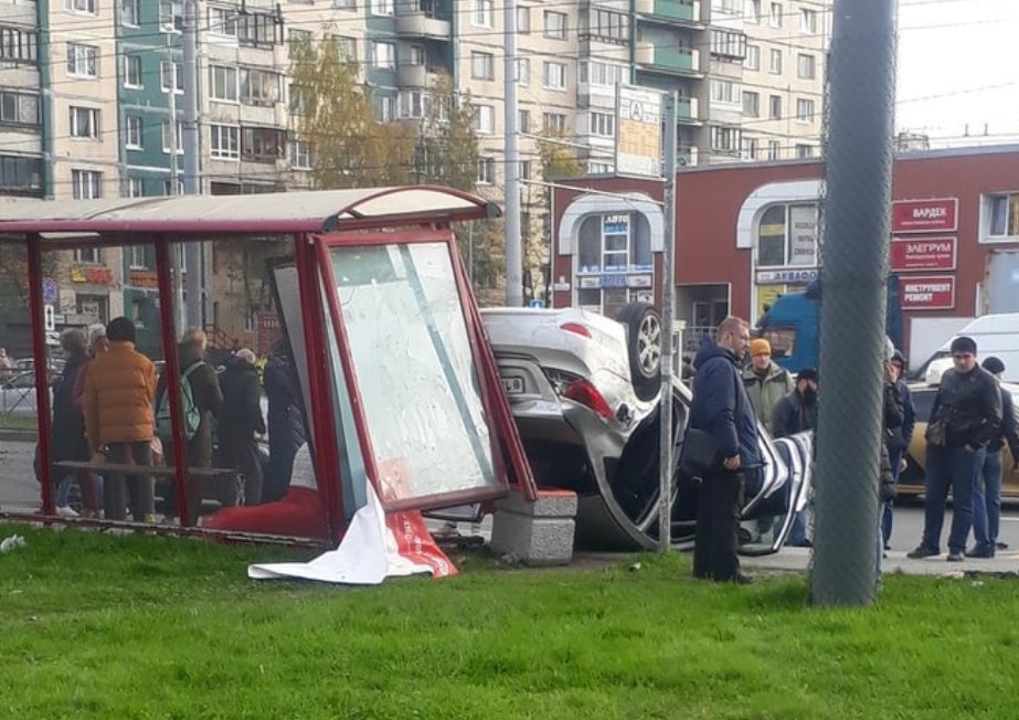 Инцидент произошёл на проспекте Косыгина. Автомобиль Hyundai врезался в остановку и опрокинулся. Пострадали водитель и пассажир машины. По словам очевидцев и данным местных СМИ, это молодожёны, которые ехали в ЗАГС.