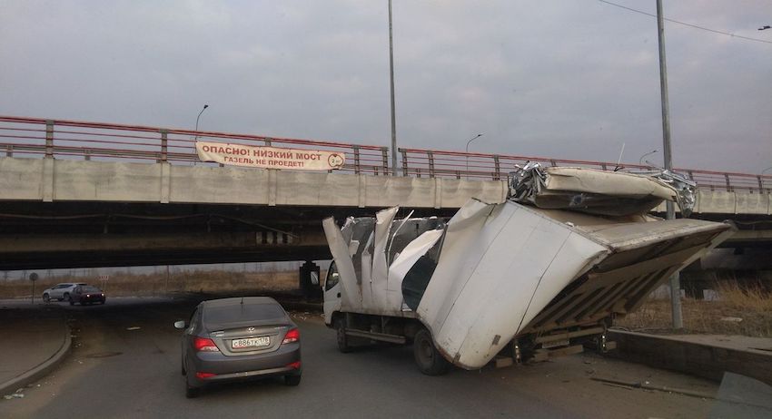 Под знаменитым «мостом глупости» в Санкт-Петербурге застряла ещё одна грузовая «ГАЗель». Нынешняя жертва стала уже 152-й по счёту. Водитель не заметил предупреждающих знаков и сорвал кузов автомобиля.