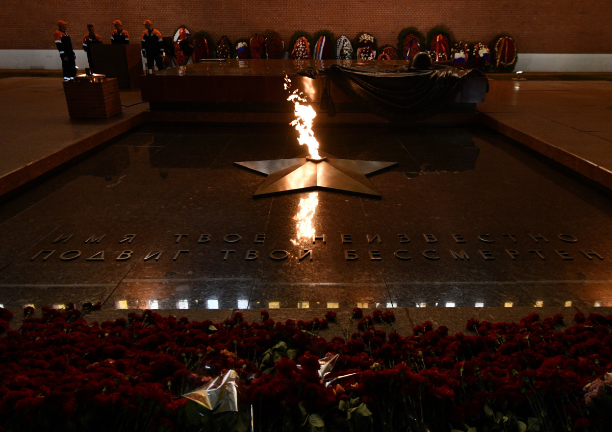 Неизвестный мужчина решил постирать свою одежду и высушить над Вечным огнём в городе Раменском Московской области. Запечатлели акт вандализма на площади Победы очевидцы, проезжающие мимо.
