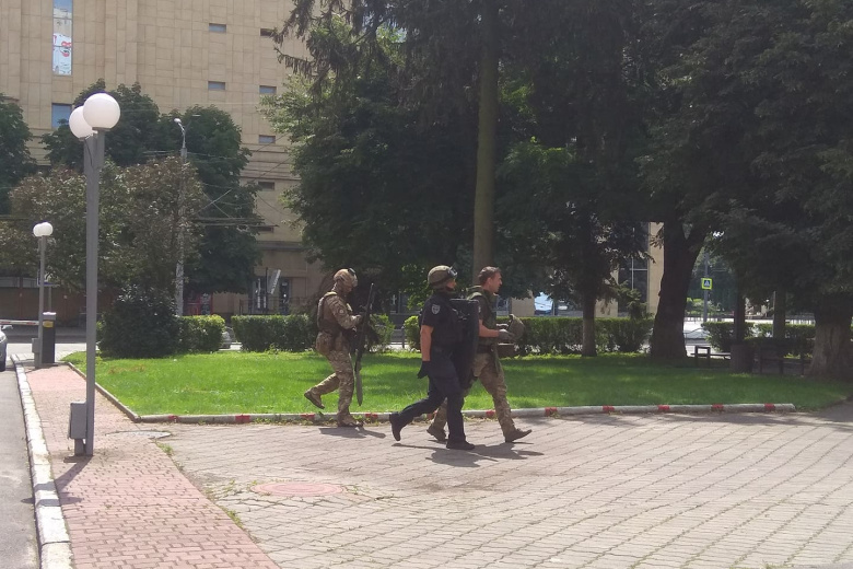 Снайперы приехали на Театральную площадь в украинском Луцке, где мужчина захватил автобус с 20 заложниками и заявил о наличии взрывного устройства.